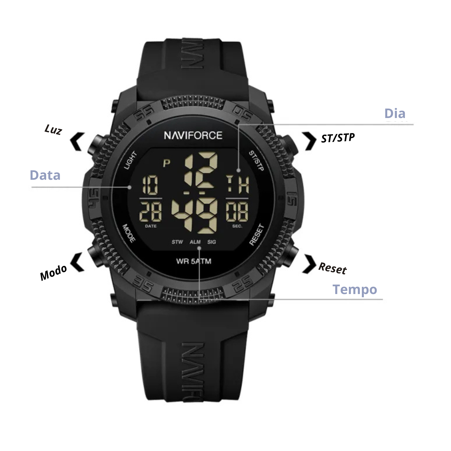 Pesando apenas 59 g, este modelo se destaca pela leveza e conforto, sendo ideal para uso prolongado no dia a dia. Sua resistência à água de até 50 metros permite o uso em situações como chuva, lavagem de mãos e até mesmo natação leve, garantindo segurança e durabilidade.