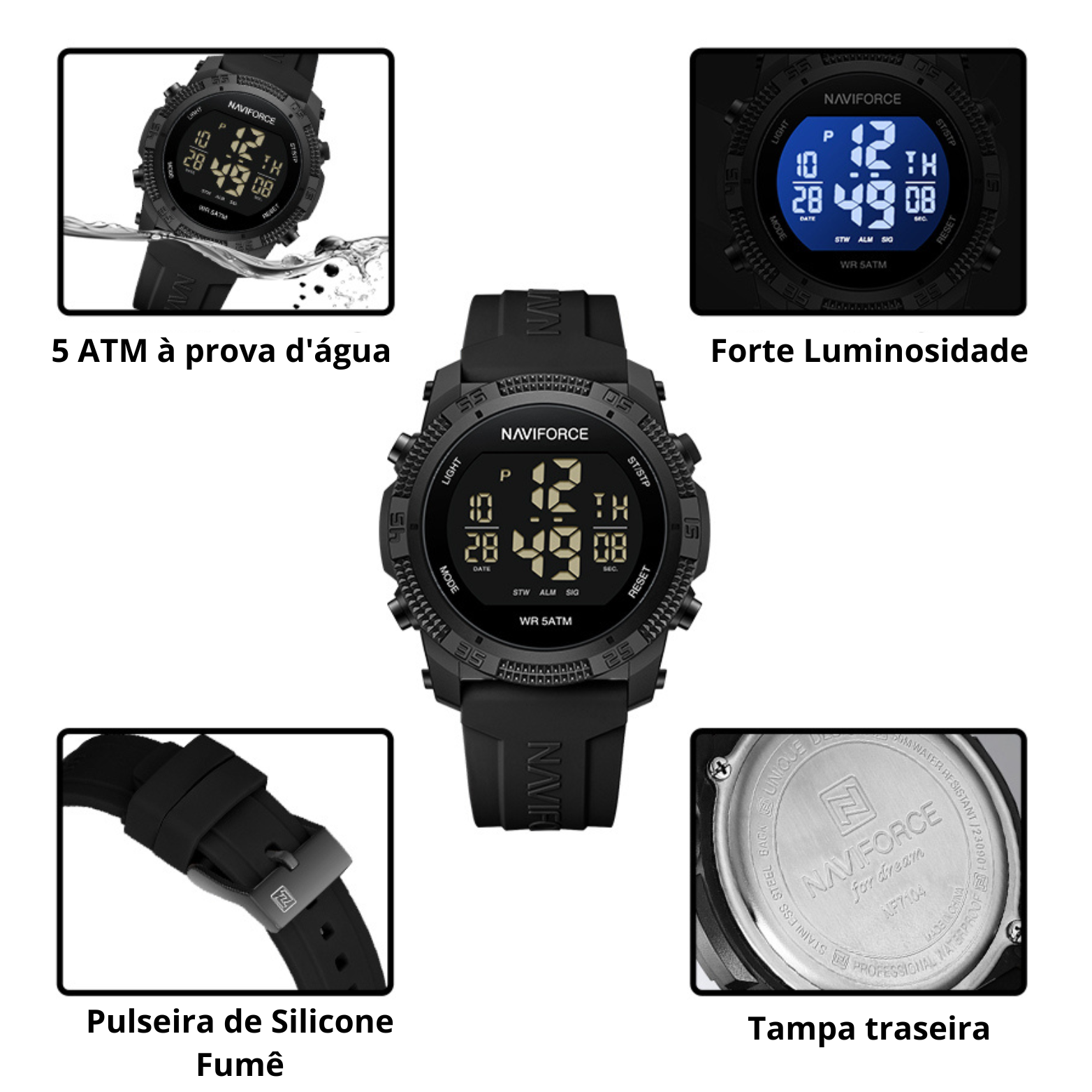 Com um diâmetro de 45 mm e espessura de 13,5 mm, o NF7104 apresenta uma estrutura robusta, sem abrir mão do conforto. Sua pulseira de sílica fumê é leve, flexível e resistente, oferecendo um encaixe perfeito no pulso. O fecho de fivela garante segurança durante o uso, mesmo em atividades intensas.